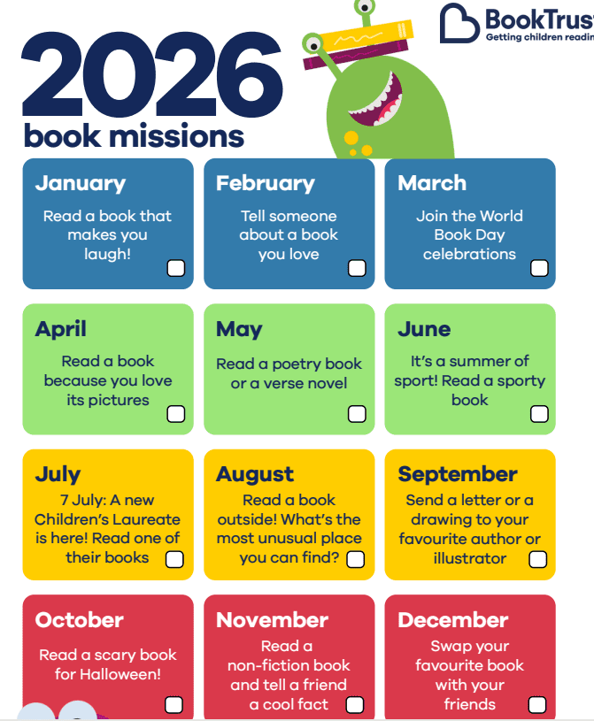 • The Book Trust 2026 Book Mission — a monthly, book‑themed challenge for everyone to enjoy throughout the year. We’ll also be inviting parents to join us for a story during National Storytelling Week in February (see the latest bulletin for details).