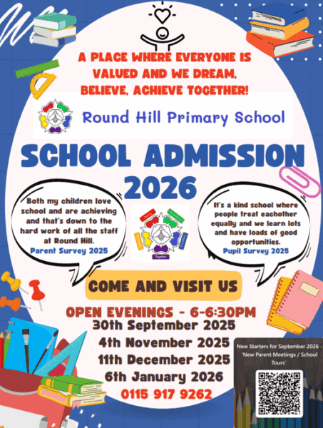 All of the ‘New Parent Meetings / School Tours’ will start with a meeting in the school hall with Mr Nash, Head Teacher, along with members of our School Teaching Team. This will be followed by a short tour of the school. There will be an opportunity to ask questions within a group situation or on an individual basis. All of the ‘New Parent Meetings / School Tours’ will last approximately 30 minutes. If after attending one of the Events you have any additional questions, you can email these to us at: office@roundhill.notts.sch.uk